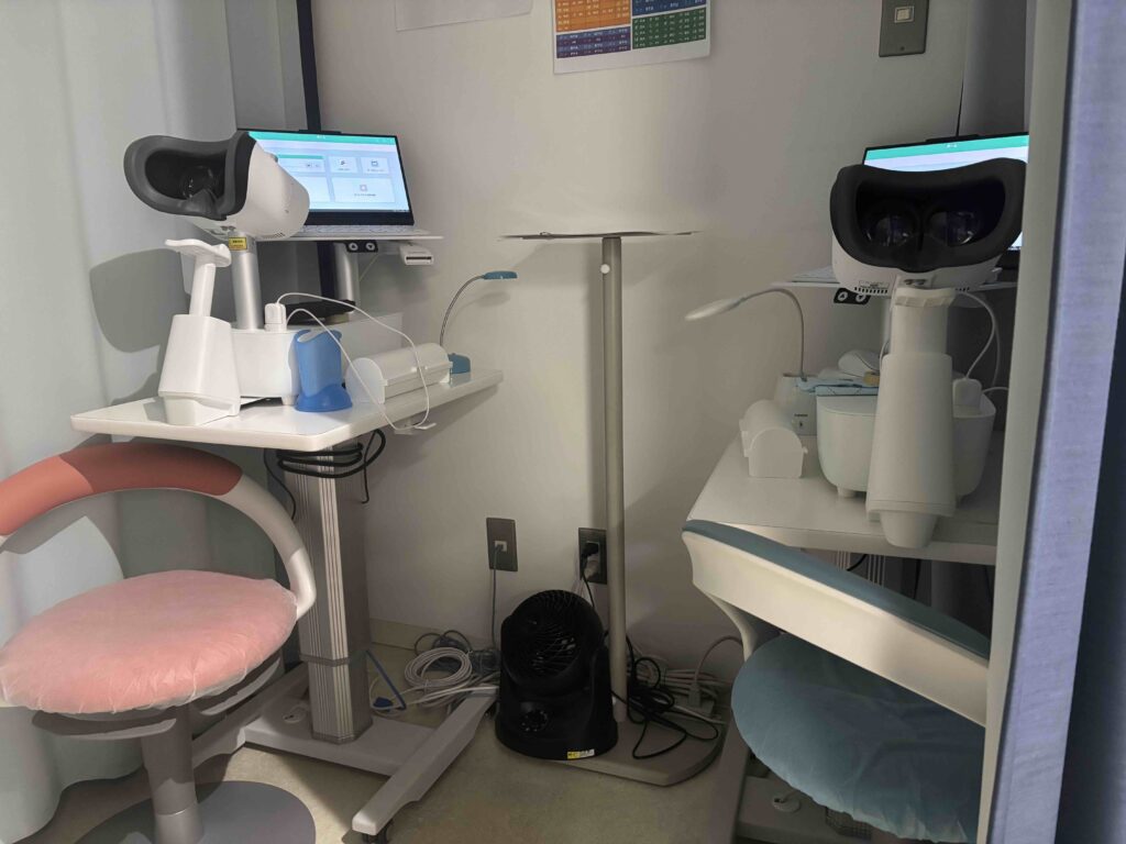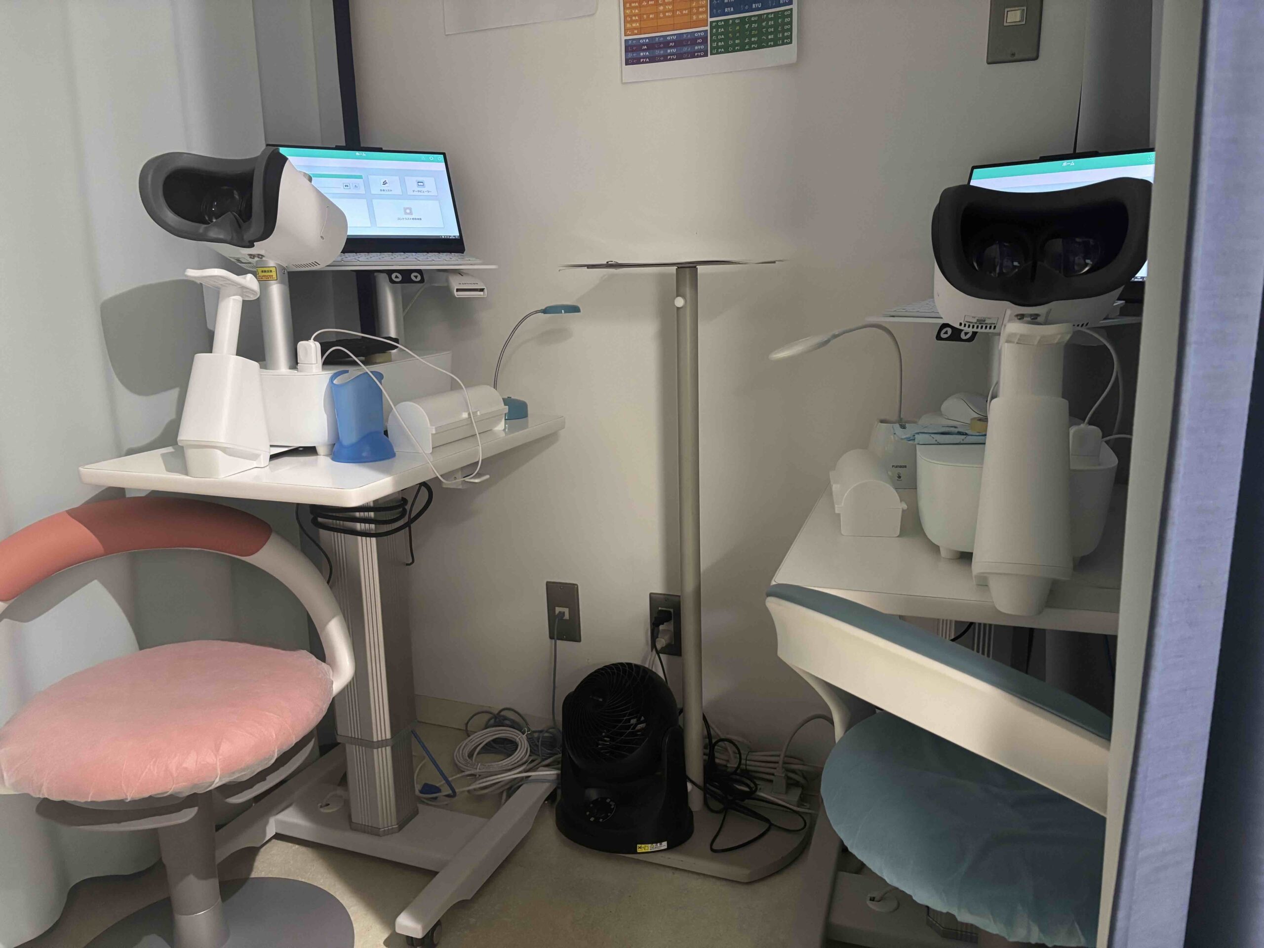 新しい視野計であるアイモ vifaを増設しました。従来のハンフリー視野計とは異なり、アイパッチによる片眼遮蔽が不要で、両眼同時に視野検査を行うことが出来ます。検査時間も短時間になるのに加え、より多くの情報を得ることができます。ハンフリー視野では基本的には24度か30度の角度を視野を測定しますが、中心視野が狭い方や、近視が強い方は10度の角度の視野を測ることがあります。ハンフリーでは24度と10度は別々に測る必要があるのですが、アイモでは24plus(1+2)という同時に両方測ることができるプログラムを使用しています。アイモ vifaは以前から1台設置しておりましたが、2台体制としました。従来3台あったハンフリー視野計は2台となり、計4台の視野計を用いながら、よりご負担がすくなくなるよう、かつ精密な緑内障管理をしてまいります。